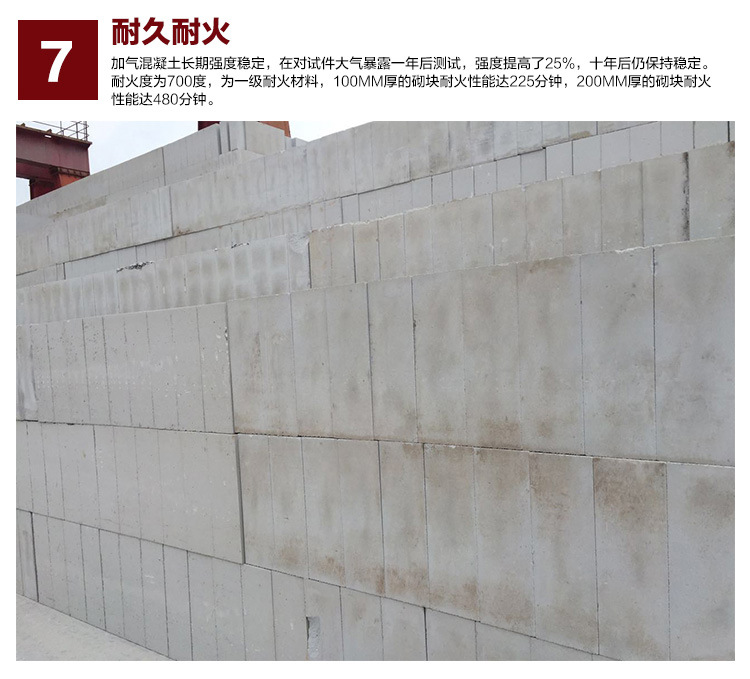 8、 耐久:加氣混凝土長期強度穩定,在對試件大氣暴露一年后測試,強度提高了25%,十年后仍保持穩定。