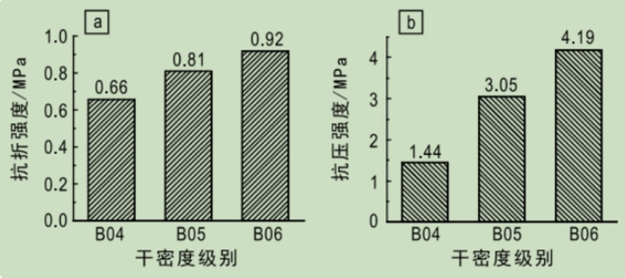 從圖中可以看出,隨著干密度級別的提高,砂加氣混凝土的抗折、抗壓強度均增加,且呈非線性變化。